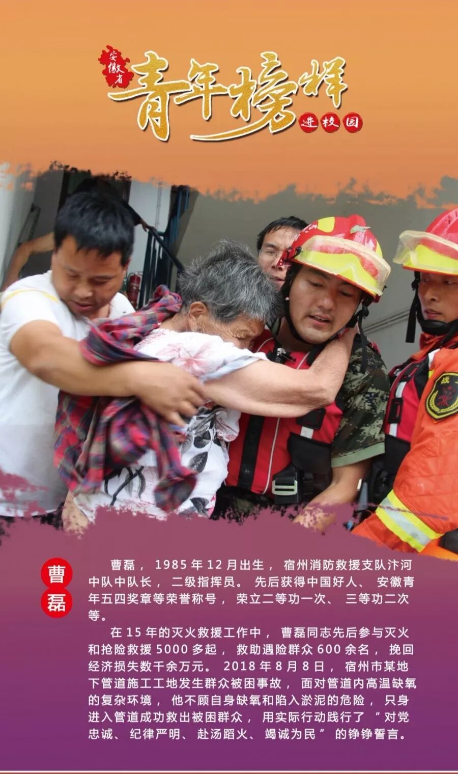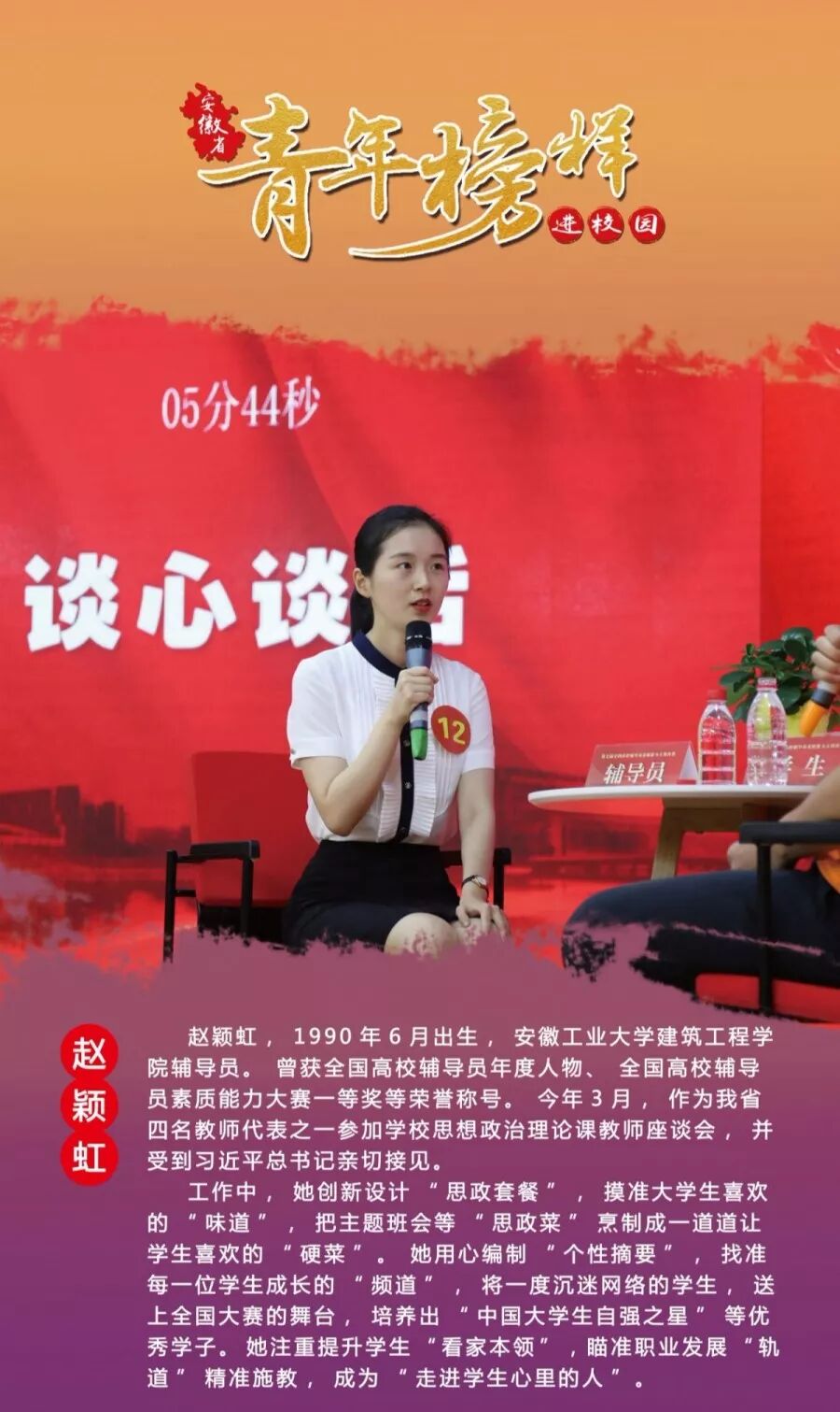 12月11日下午,由省委宣傳部、團(tuán)省委、省委教育工委聯(lián)合主辦的“青年榜樣進(jìn)校園”活動在安徽師范大學(xué)花津校區(qū)大禮堂舉行。團(tuán)省委黨組書記、書記孔濤,省委宣傳部副部長范榮暉,安徽師范大學(xué)黨委書記胡朝榮,團(tuán)省委副書記李躍波、安徽師范大學(xué)副校長畢明福,中宣部宣教局相關(guān)處室同志等出席活動。各行業(yè)青年榜樣代表、安徽師范大學(xué)師生代表約800人參加了現(xiàn)場活動,60余萬人觀看在線直播。中國好人、安徽五四青年獎?wù)、全國自?qiáng)模范夏云興作為青年榜樣代表應(yīng)邀出席。